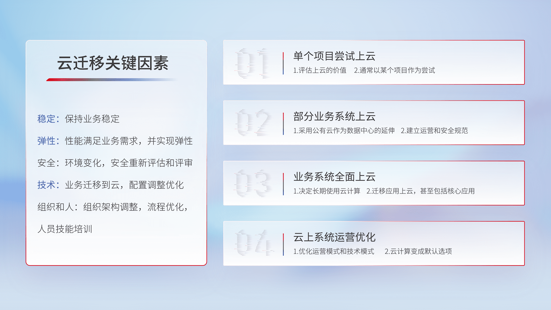 结合实际业务,,,从规划设计、、云平台选型、、云原生改造、、数据迁移、、集成交付,,,迁移全过程为客户识别最佳上云路径,,,做好风险识别管理,,设计网络架构、、身份权限、、、、安全审计合规、、、、操作审计、、、日志审计、、、监控告警策略、、、、多站点容灾设计等,,,对云上基础设施进行整体规划,,,提升IT治理水平,,以满足弹性、、、、高可用、、高性能的需求。。。。