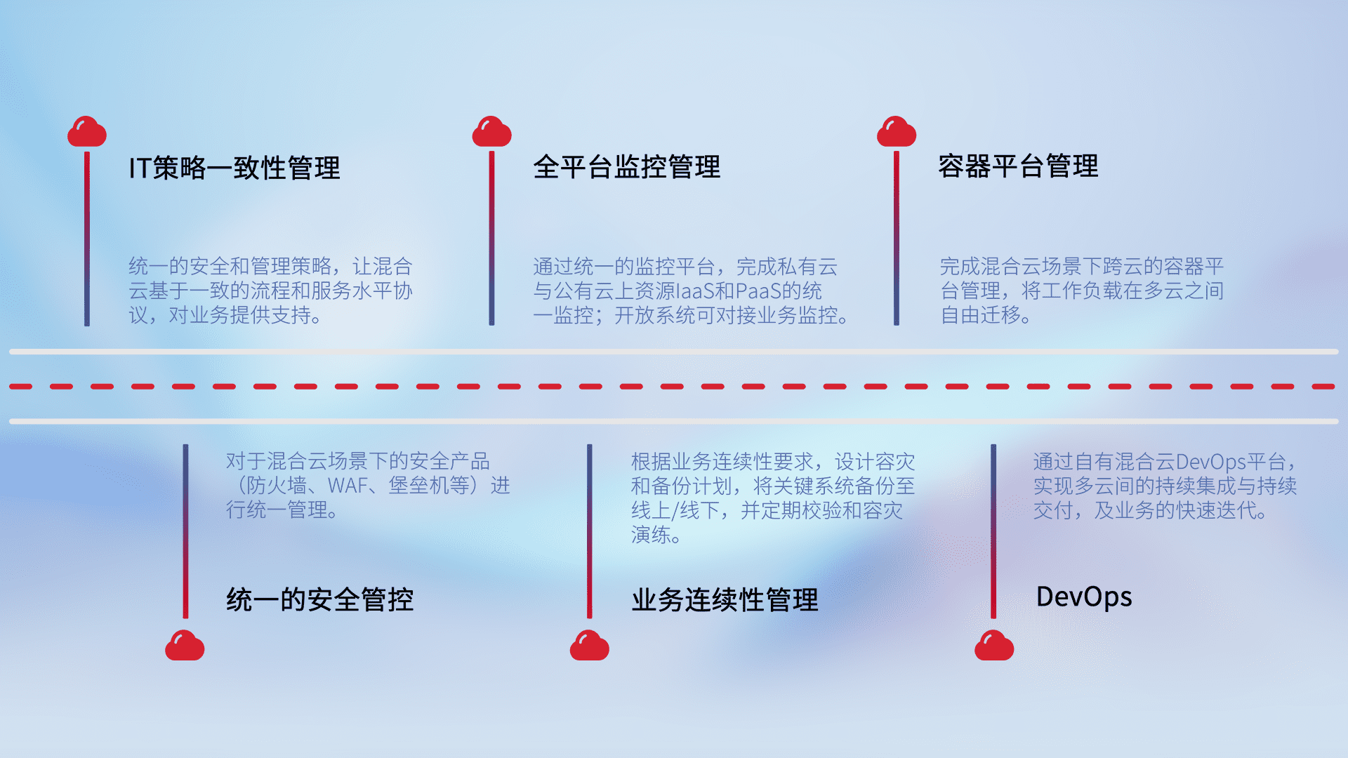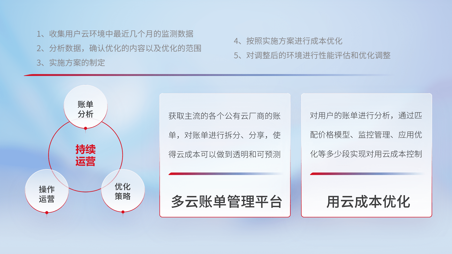 通过多云纳管,,以统一的资源数据模型把客户的云资源进行抽象和封装,,进而实现对多云资源的统一操作,,,,保障云资源管理的可靠性、、、稳定性与可用性。。。量身定制化运维内容,,配置、、、开发运维、、、、补丁管理、、、备份、、、监控、、认证和访问管理、、、、审计和日常巡检等,,,保障在用云过程中的可靠度,,稳定度以及高可用率。。。