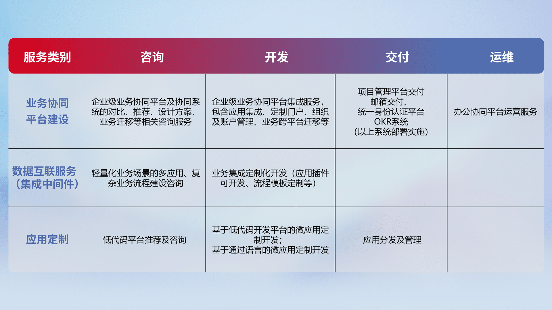 针对钉钉、、、、企微、、、IDaas等平台级产品提供产品的规划、、、方案、、、、交付、、定制化开发等服务,,实现如统一协同办公、、、智能客户服务、、混合会议管理、、智能数据查询、、、、等业务场景,,实现数字化转型。。。